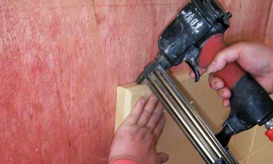 貼幾個(gè)點(diǎn),將板平貼在石膏板上,用打釘器將釘固定在吸音板開榫處,吸聲板之間用插
